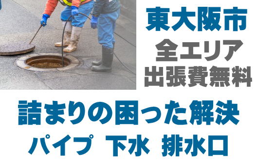 東大阪市で排水つまり、トイレ詰まり、シンクつまりなどの排水トラブルはお任せください。店舗の厨房、グリストつまりも対応しております。配管つまり、マンホールの溢れ、下水の臭い、排水管のトラブルは最短15分到着!