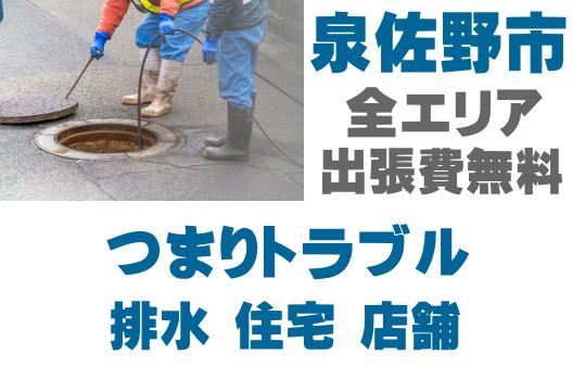 泉佐野市で排水つまり、トイレ詰まり、シンクつまりなどの排水トラブルはお任せください。店舗の厨房、グリストつまりも対応しております。